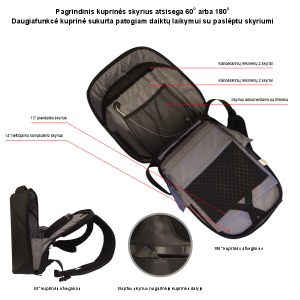 Sukurta patogiam naudojimui ir apgalvotais skyriais. Ši kuprinė gali talpinti įvairius daiktus, tokius kaip: gertuvė, knygos, piniginė, rašikliai, telefonas, nešiojamas maitinimo šaltinis, planšetė ir nešiojamas kompiuteris.