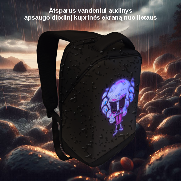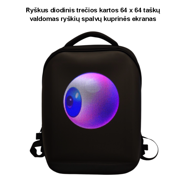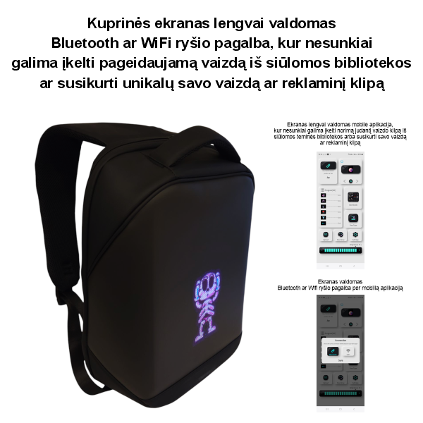 Kuprinė turi ryškių spalvų LED ekraną, kurį galima programuoti naudojant mobiliąją programėlę (Android / iOS) per Bluetooth ar WiFi ryšius, leidžiant lengvai pritaikyti pagal savo poreikius.