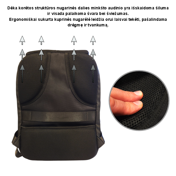 Pagaminta iš Oksfordo audinio su ergonomišku koriniu tinkleliniu ir kvėpuojančiu audiniu nugarinėje dalyje yra atspari vandeniui, patogi su galimybe pritvirtinti prie lagamino rankenos.