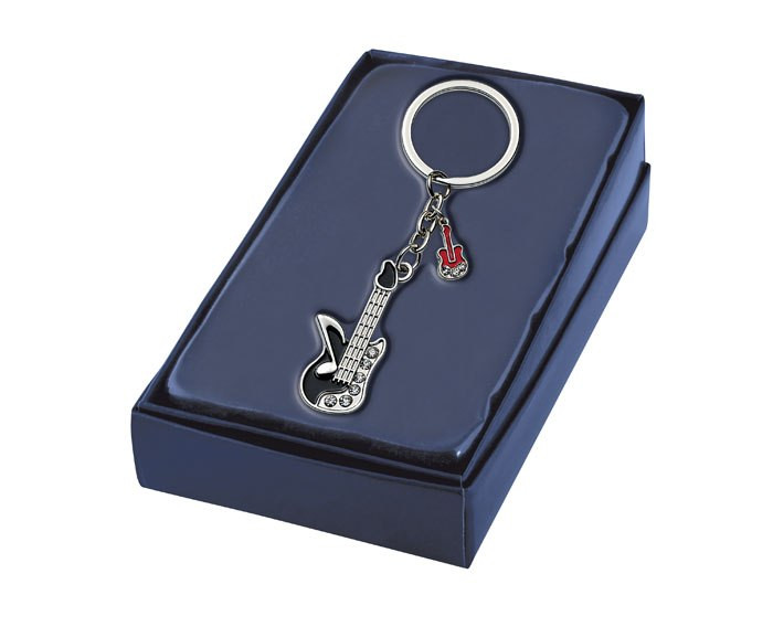 Metalinis blizgus dažytas raktų pakabukas elektrinės gitaros formos. Komplektuojamas su kartonine dėžute.